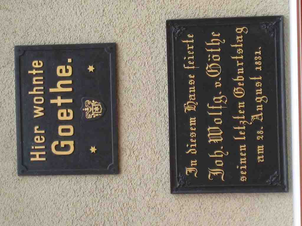 The sign says, "Here lived Goethe... In this house, Johannes Wolgang von Goethe celebrated his birthday on August 28, 1821"