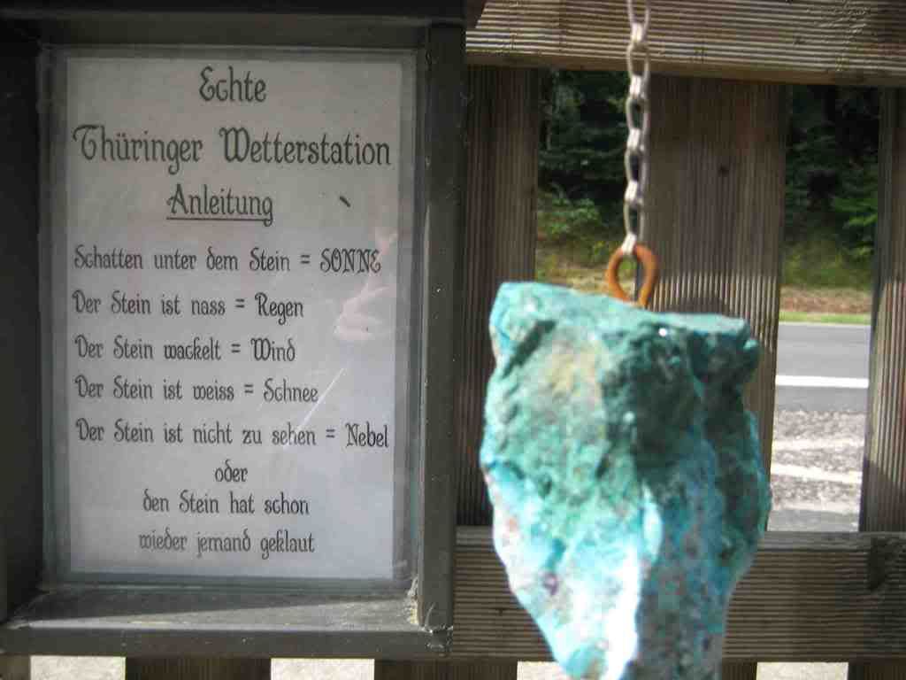 A rock and sign in front of the Gästehaus. The sign says, "Genuine Thuringian Weatherstation... If there is sunshine under the rock, there is sun. If the rock is wet, its raining. If the rock is swinging, its windy. If the rock is white, its snowing. If the rock is not there, its foggy or someone has stolen the rock."