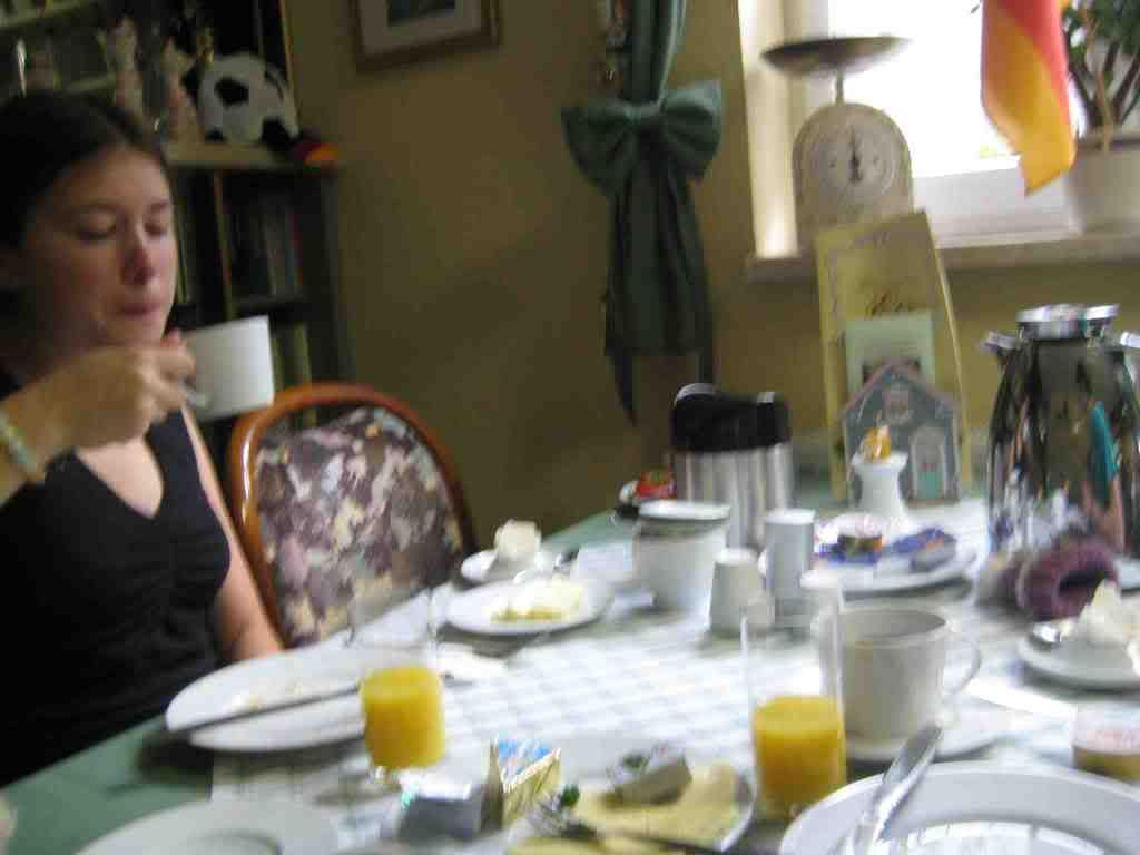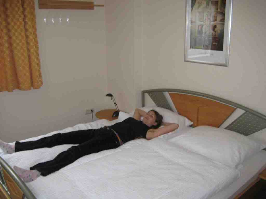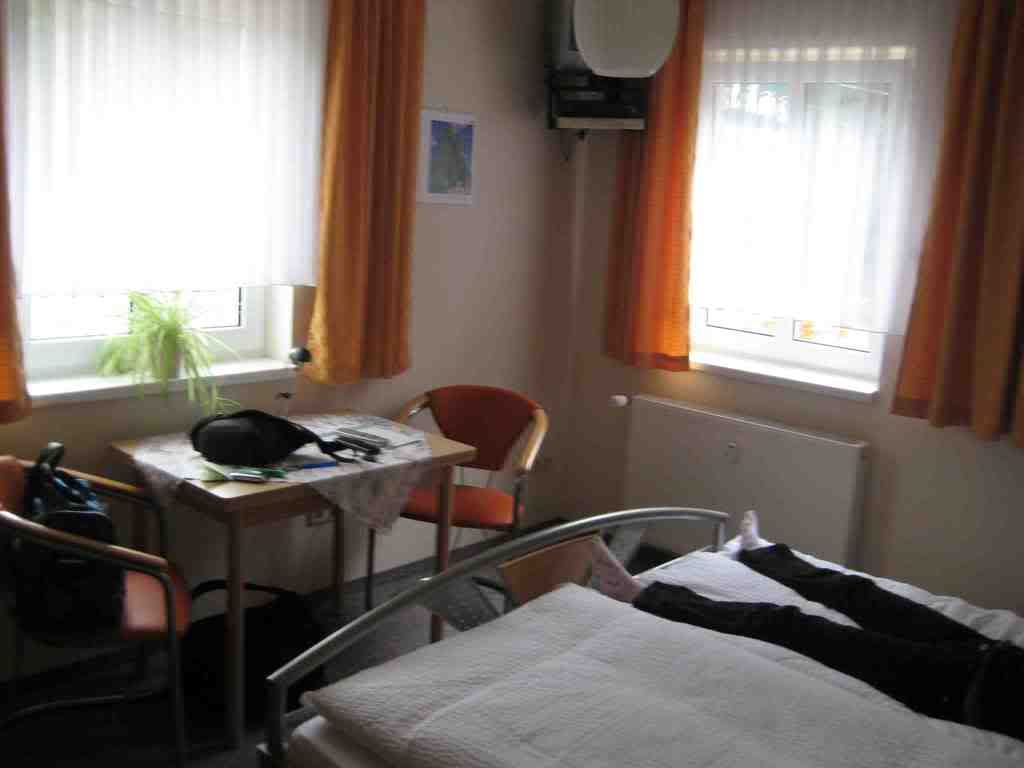 We looked up the number in the Germany handbook Ashley had and called the number but no one picked up. We eventually got back into town and found the office for the housing but no one answered the door or the phone, so we went to get food at this Ali Baba place. We both got pizza and by the time we were done, the people picked up their phone. We eventually figured it all out after wasting a bunch of coins on the pay-phone. Apparently we did have the right address, we just didn't walk far enough (about 2.8km to be exact), so we took a taxi with a jubilant taxi-driver. He complimented Ashley on her German and asked where she was from. She said Kalifornien and he mentioned that we had an actor as our governer (Arnold Schwarzenegger, of course).