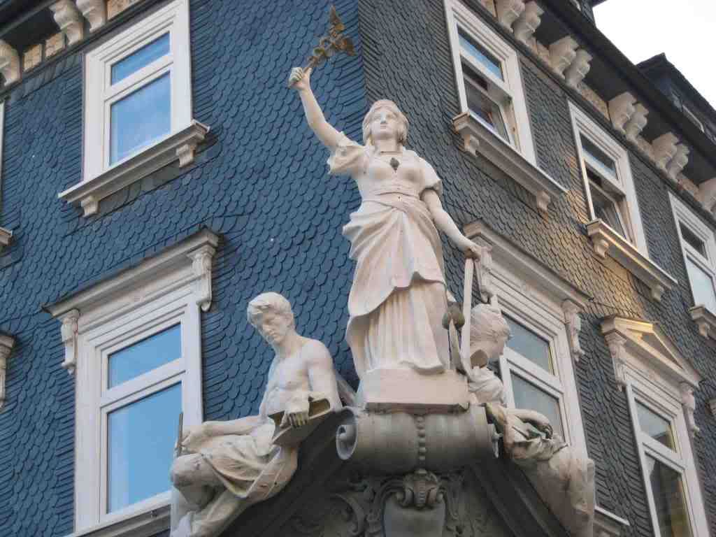 A caduceus-wielding woman on the corner of a bookstore called Buchhandlung Grimm (named after the Grimm Brothers who are famous for collecting German folk-tales and systematizing the German language in various ways)