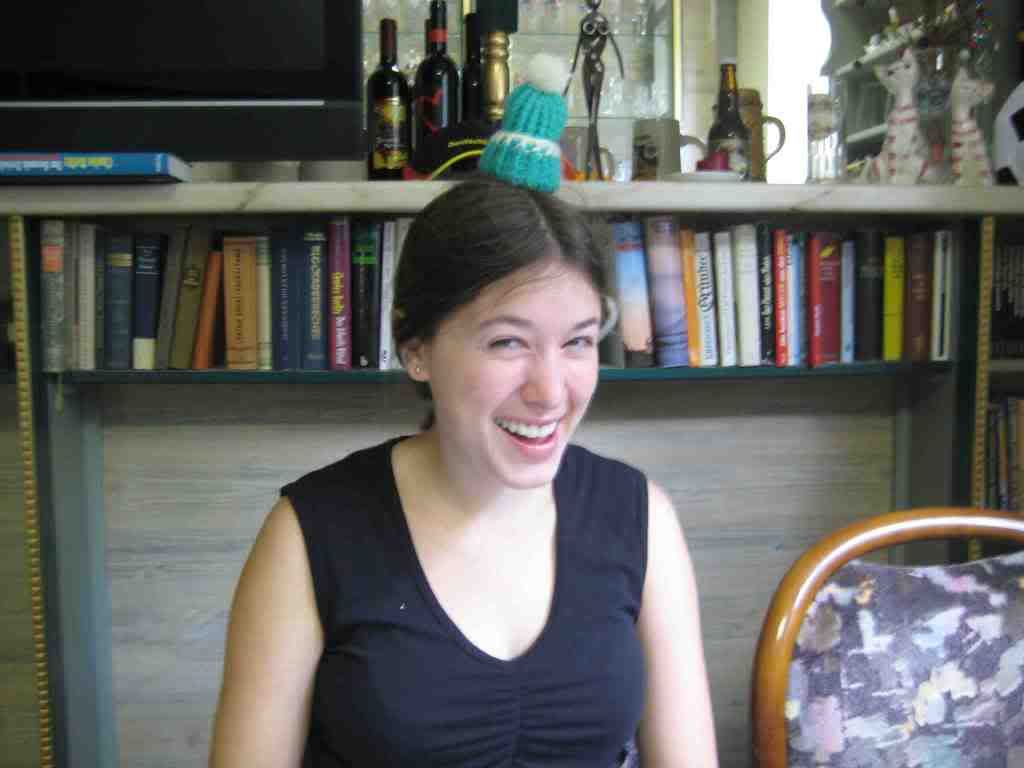 In Germany, they have egg-holders and little things you put over the eggs to keep them warm; here Ashley can be seen wearing this egg warmer as a little turquoise hat