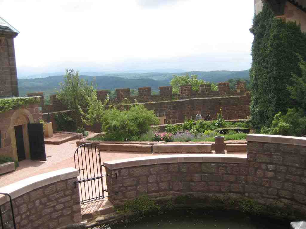The courtyard of Wartburg fortress, with a coy pond at the bottom of the picture and Thüringen Wald on all sides in the distance