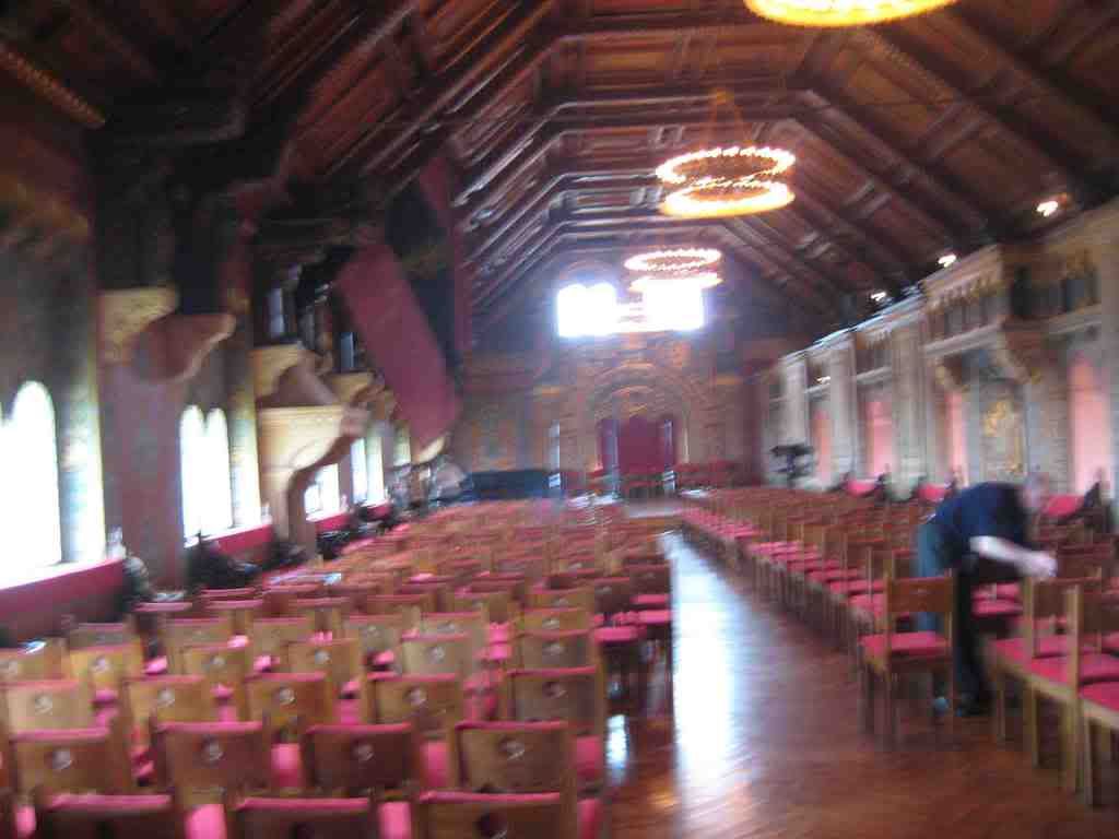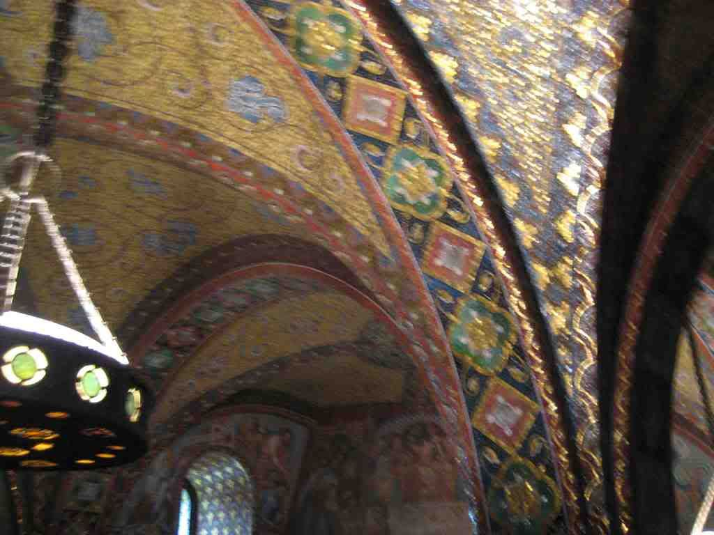 Inside, there was a room holding old artifacts first, which was the oldest room in the fortress. Then we went into a somewhat plain room with a central pillar which supposedly housed some men/knights. Then we went into the dining hall where there was also a central pillar and some furniture, which was more contemporary. The ceiling, though, had the original oak rafters which they dated with dendrochronology to about 1161. Then, we went into the women's room which commemorates Saint Elizabeth. It is extremely ornate and, if you look closely, every single design is made up of tiny bits of glass, making the room a gigantic mosaic of just under4 million glass pieces.