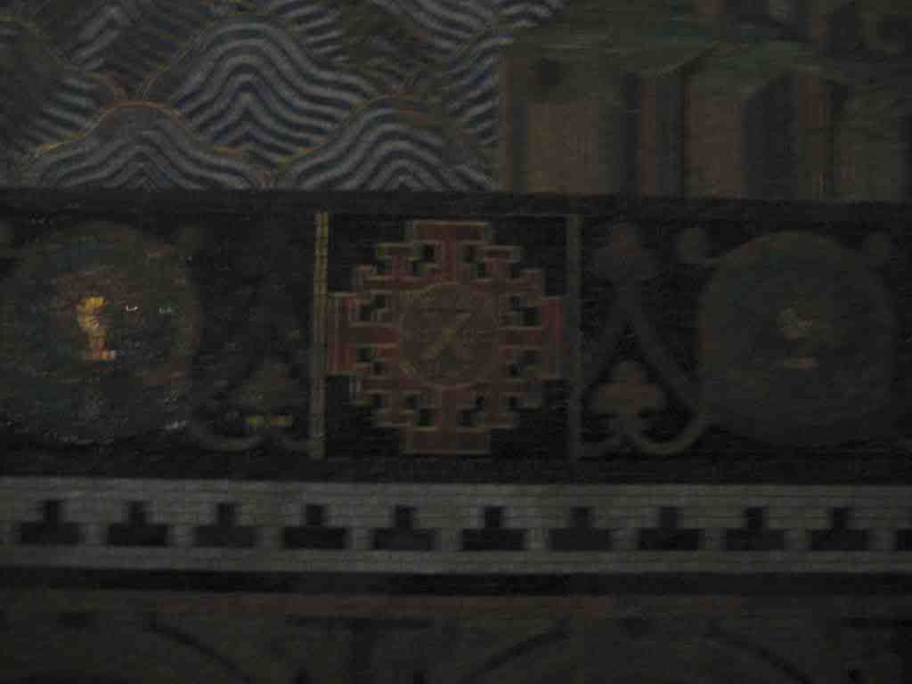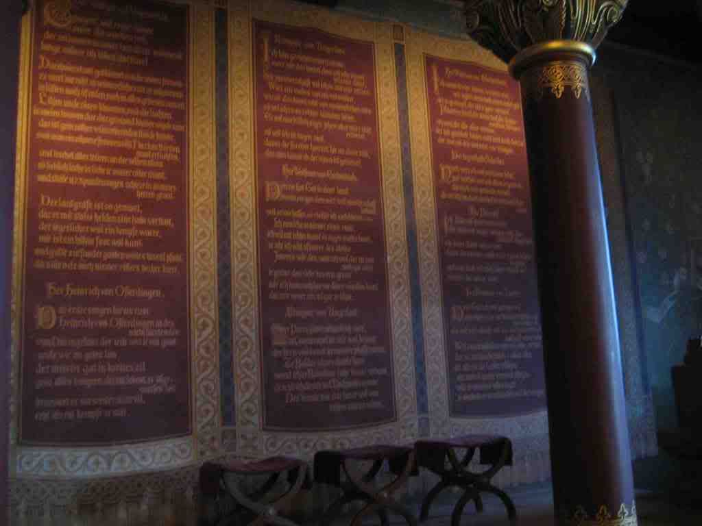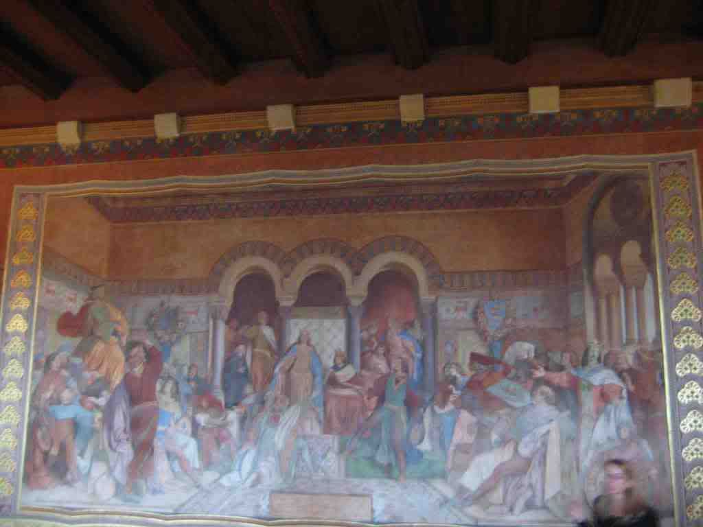 In this room that the last 2 pictures were also in (called the Sängersaal), there was a large mural depicting an old singing competition (Sängerkrieg). The story goes that five singers gathered for a competition and agreed among themselves that the worst singer would be executed. They all sang and some guy was chosen as the worst, but he cried out to St. Elizabeth's mother-in-law, the Queen, for help. She suggested that they return a year later to try the competition again. The loser took this time to find the famous Klingsor who would be an objective referee. He can be seen in the picture below floating on clouds because he was a magician. When they came together the next year, the same guy won the competition but the other four were said to sing in an equally poor manner so they were all spared. Consequently, they all sat down and ate some dinner.