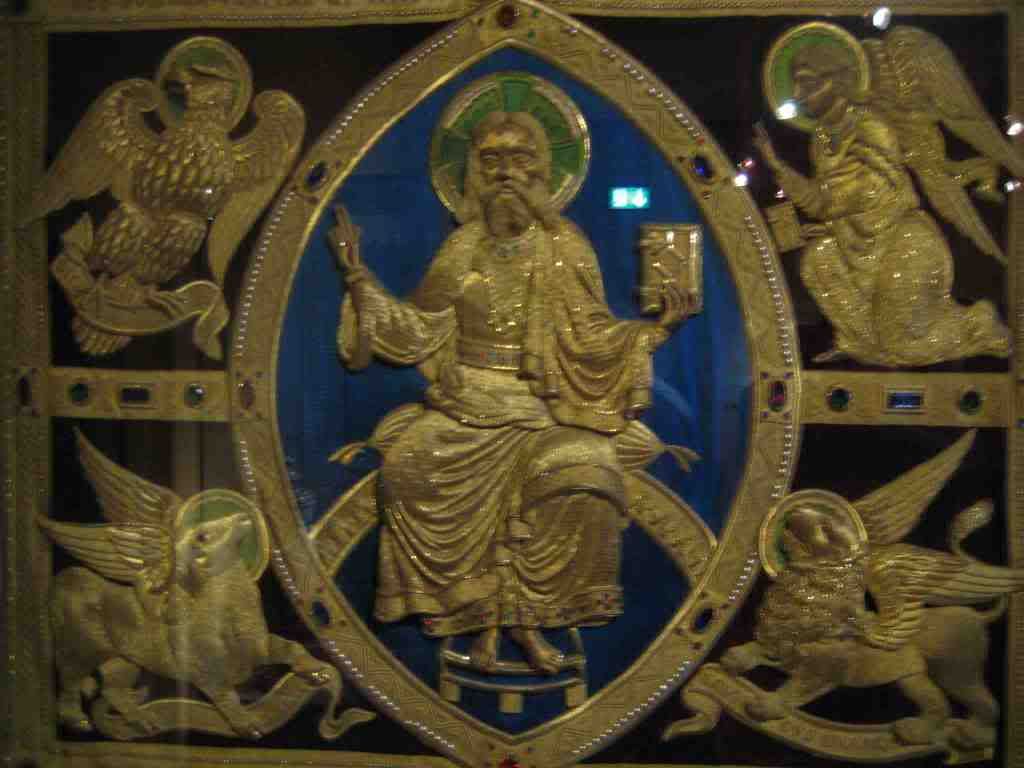 Jesus chilling amongst the four elements... errr evangelists depicted as they are in Ezekiel's vision: an eagle, a bull, a lion, and a man.