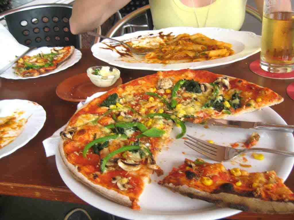 Pizza und Pasta und  spritzig Apfelsaft (pizza, pasta, and sparkling apple juice)